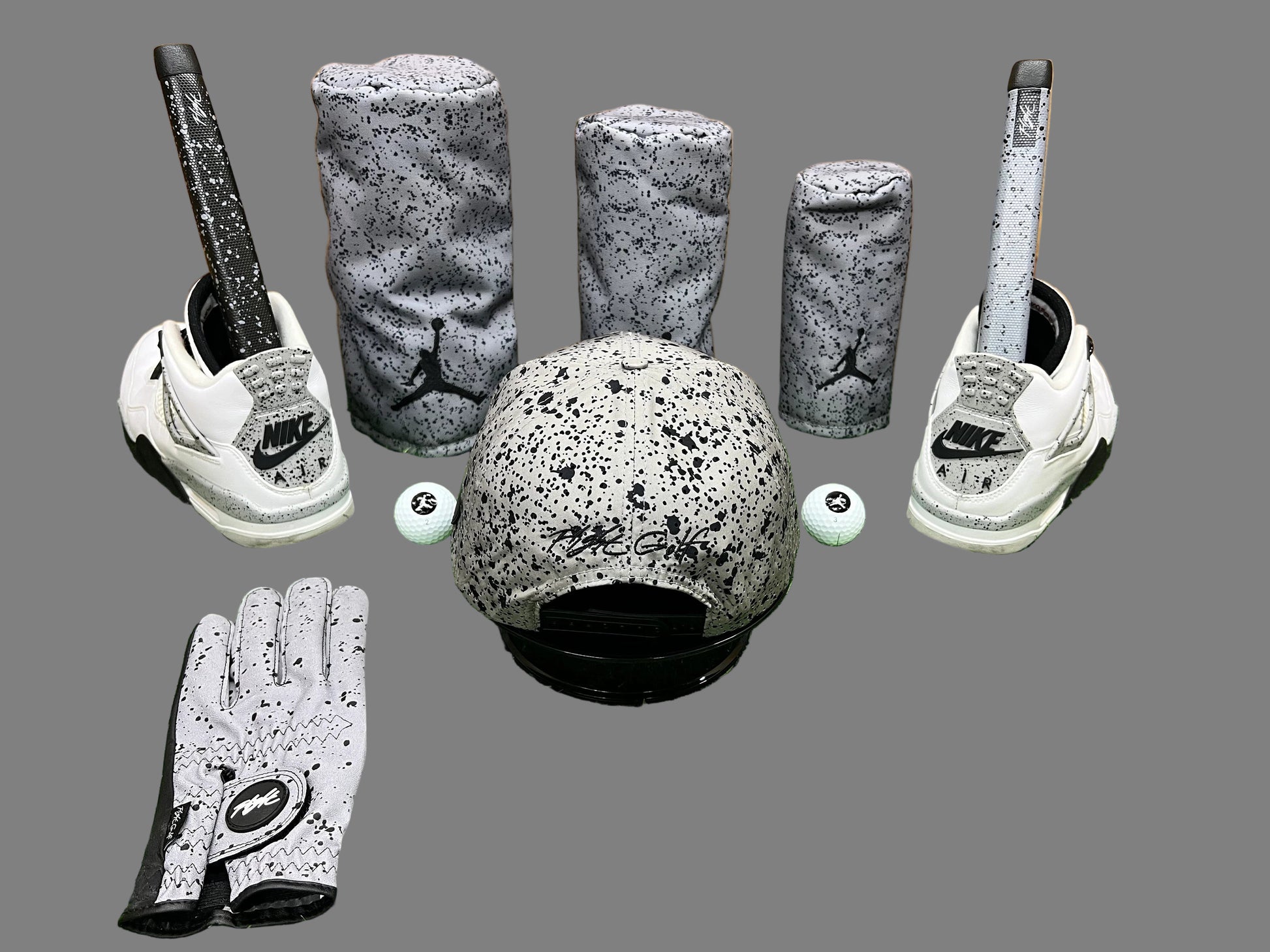 Elevate your style on and off the course with the Flight Golf Air Jordan Hat in Cement Grey with Black Splatter Print. Inspired by the iconic Jordan 4 shoe, this hat features a unique splatter design that pays homage to classic sneaker culture. Its cement grey fabric provides a sleek, modern look, while the black splatter adds an edgy, artistic touch. Crafted for comfort and performance, this hat is perfect for sunny days on the green or casual outings. Stand out and celebrate the legacy of Jordan with a piece that combines style, functionality, and a nod to basketball history. The hat is waterproof and is made specifically for golf!