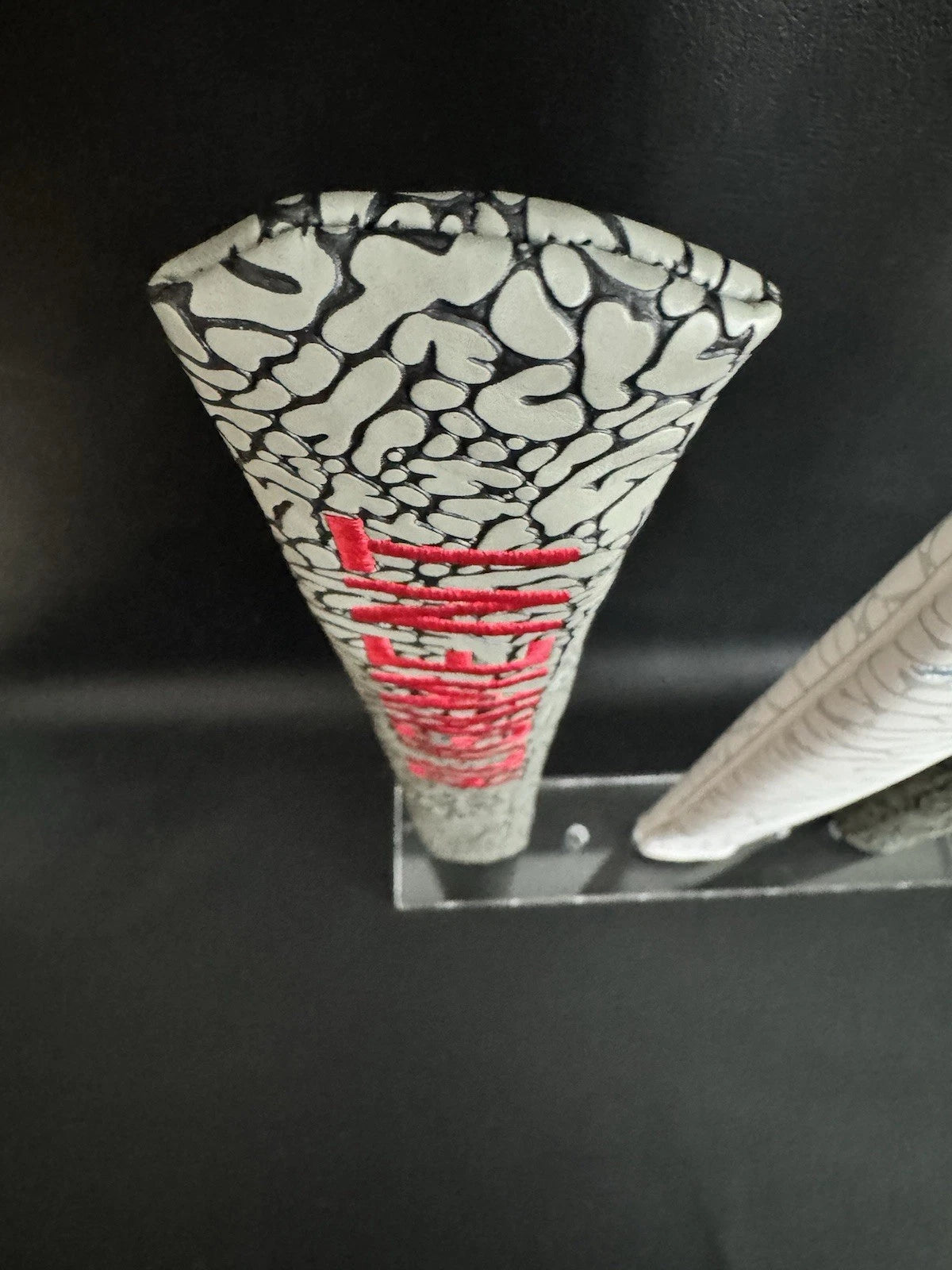 This is a recycled product from an air Jordan backpack. The material is made of soft leather canvas. The logo is embroidered on from the backpack strap. These are made from recycled back packs like in pictures.