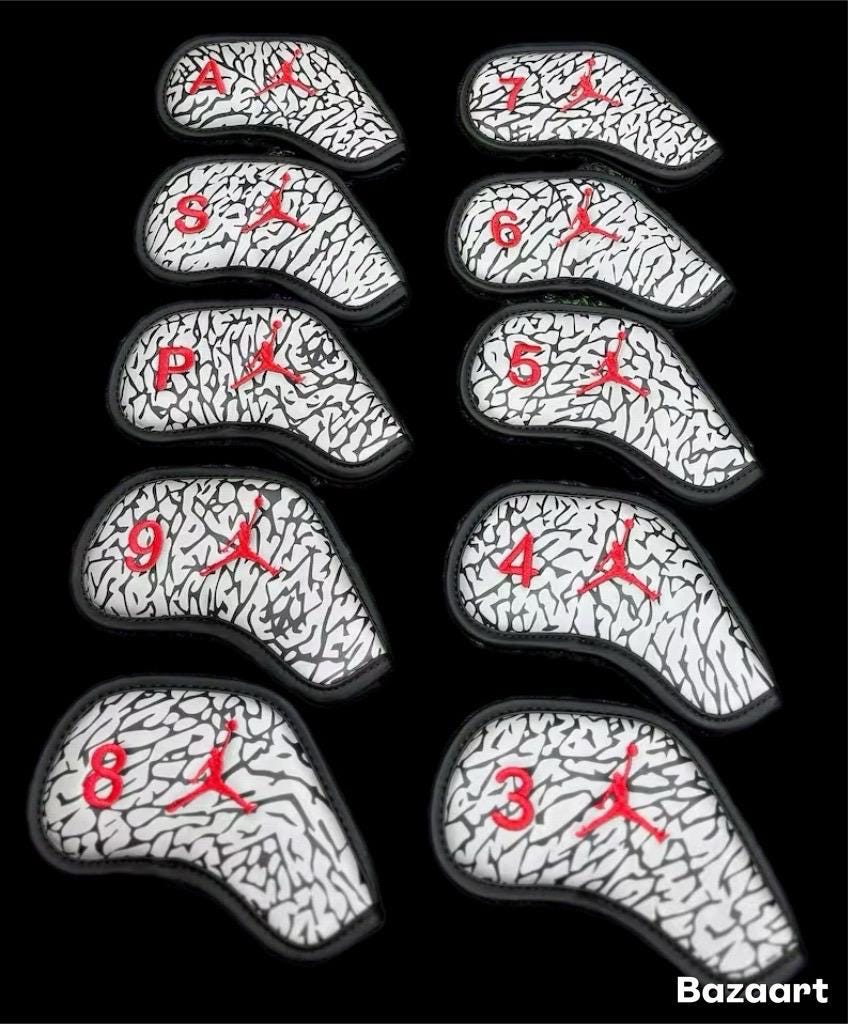 These are brand new handmade iron head covers that were made from back packs shoe bags etc. The come with a magnetic closure to ensure you never lose a cover. The inside is made of soft fleece to protect your irons while walking, cart riding or just transit to the golf course. Protect your irons in style with these Air Jordan Elephant print head covers.