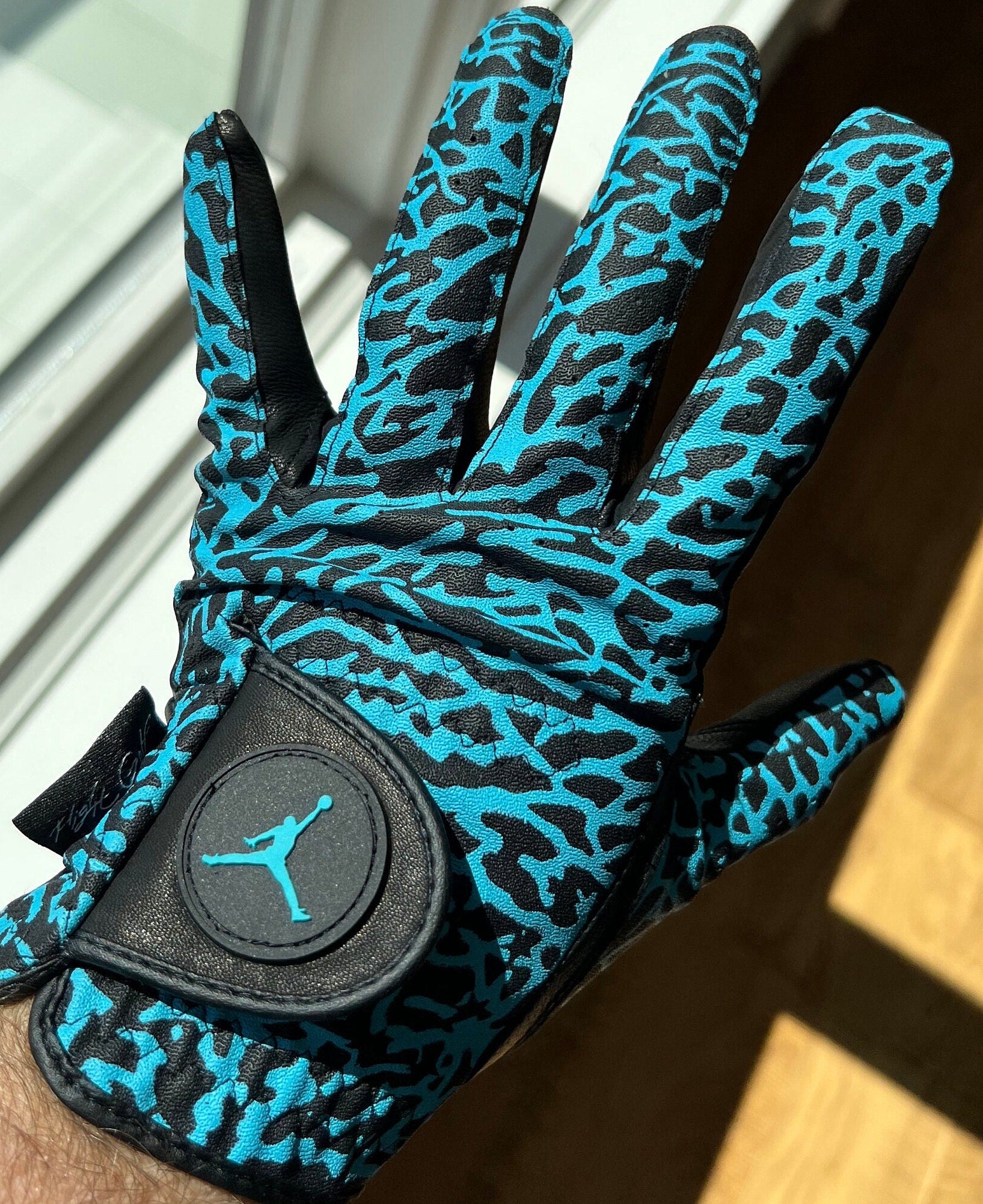 Black and Gamma Blue Air Jordan men's Golf glove. These are really spectacular and rare! They are made with 💯% premium leather Cabretta! The quality, softness and feel are amazing! The jumpman is a rubber patch so it will never stain or fade. We only have men's LEFT HAND in sizes: