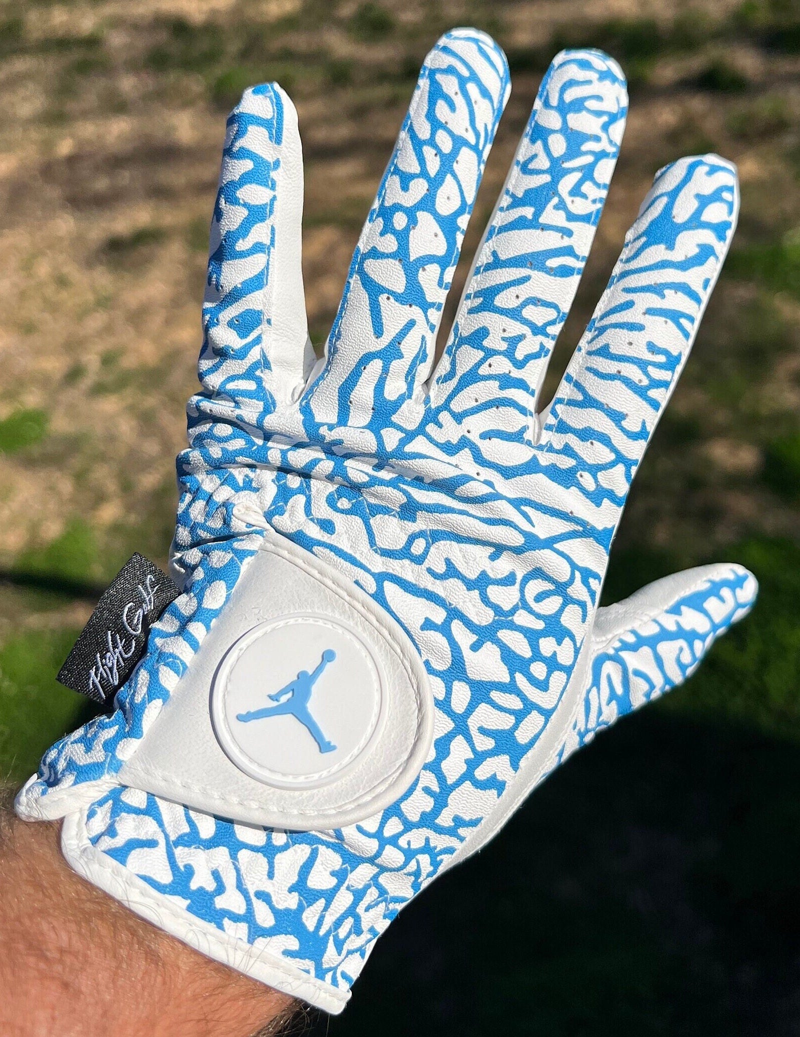 White and UNC Blue Air Jordan men's Golf glove. These are really spectacular and rare! They are made with 💯% premium leather Cabretta! The quality, softness and feel is amazing! The jumpman is a rubber patch so it will never stain or fade. We only have men's LEFT HAND in sizes: