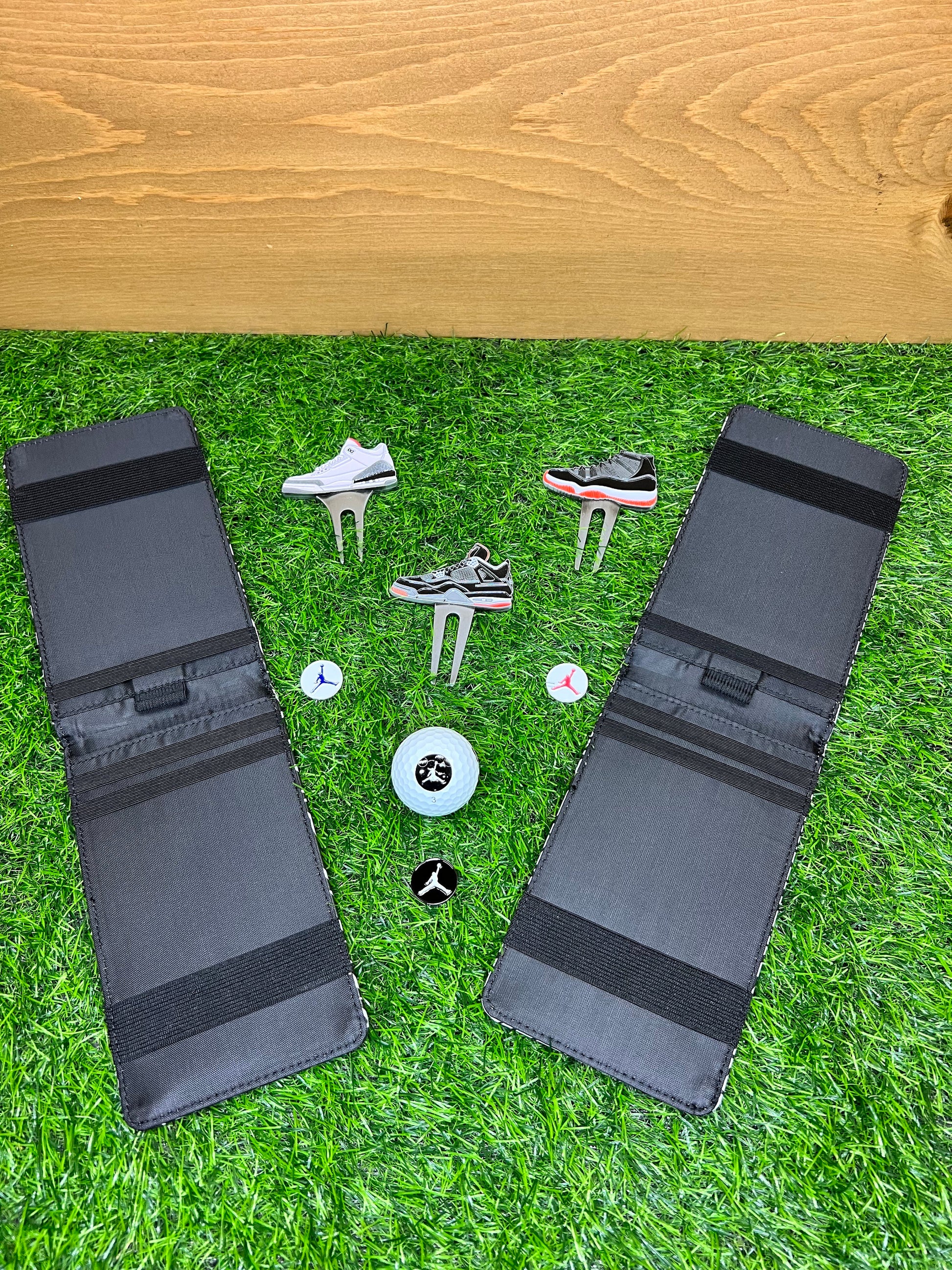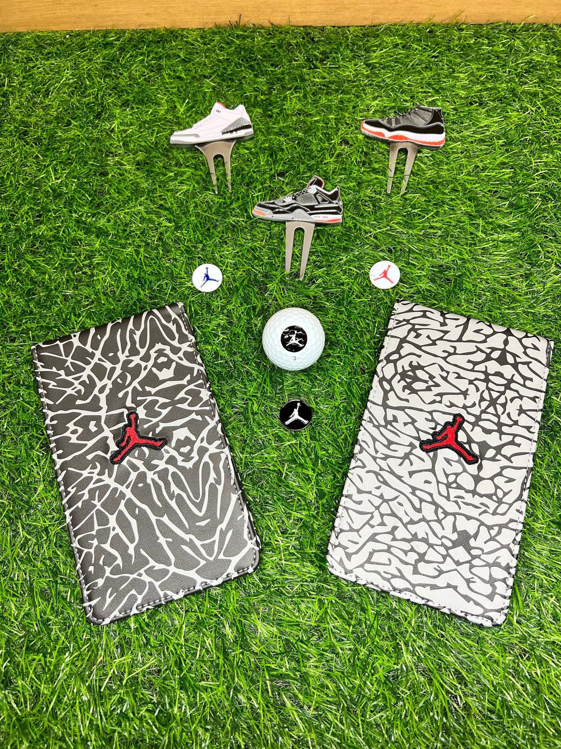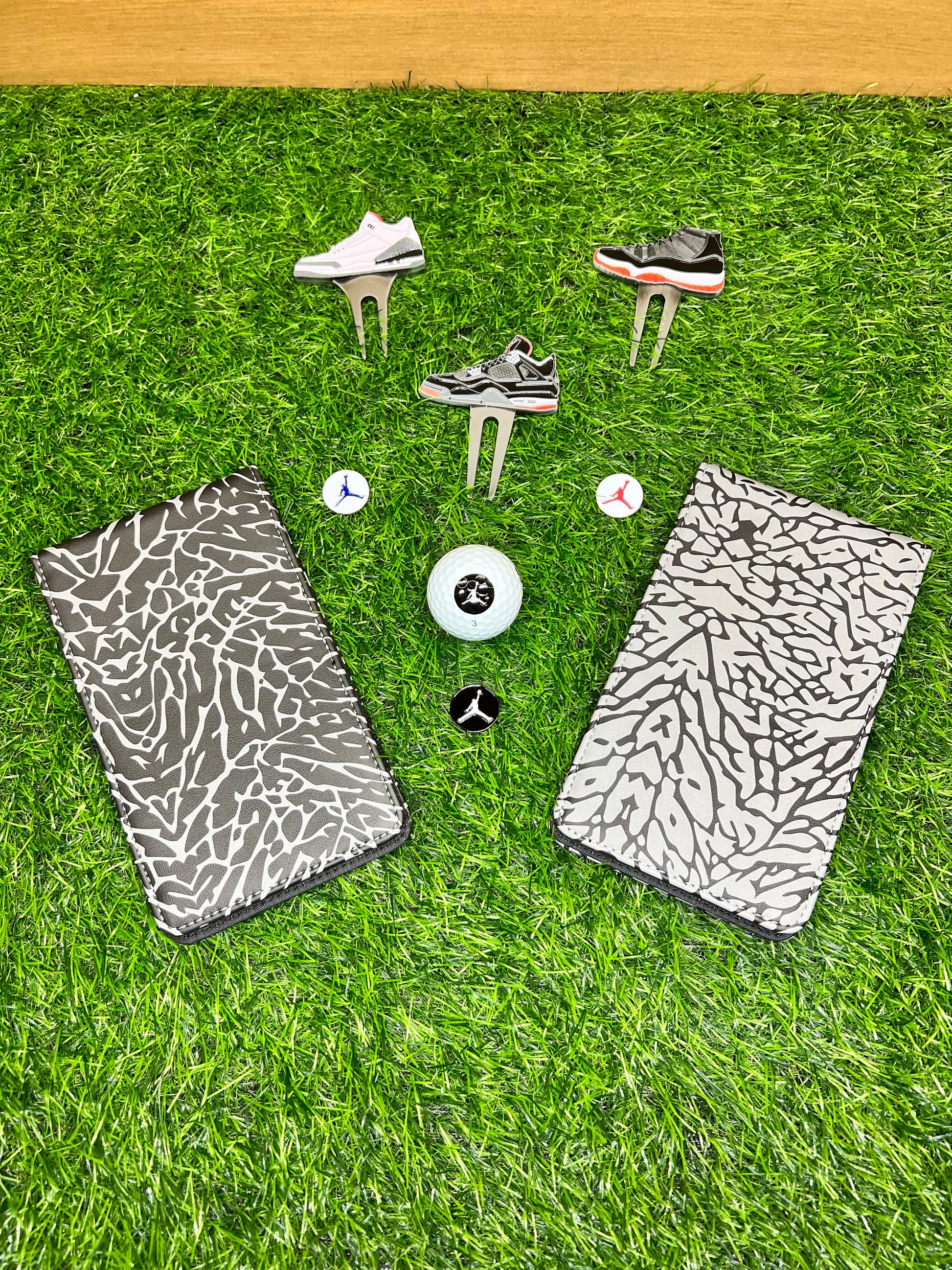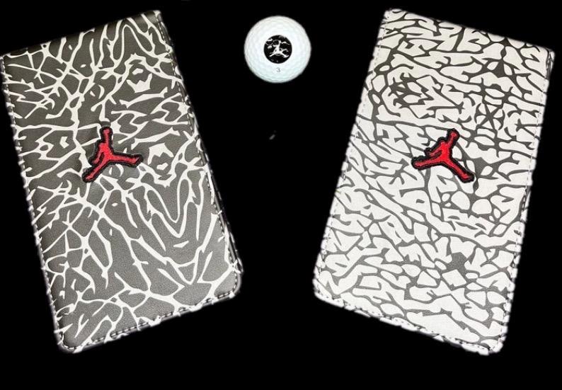These are Air Jordan Yardage book holders made from Leather that came from a recycled Air Jordan back pack. They are black or grey colors with Jordan classic elephant print. The yardage book comes with a place to also hold your pencil to keep score and make notes.