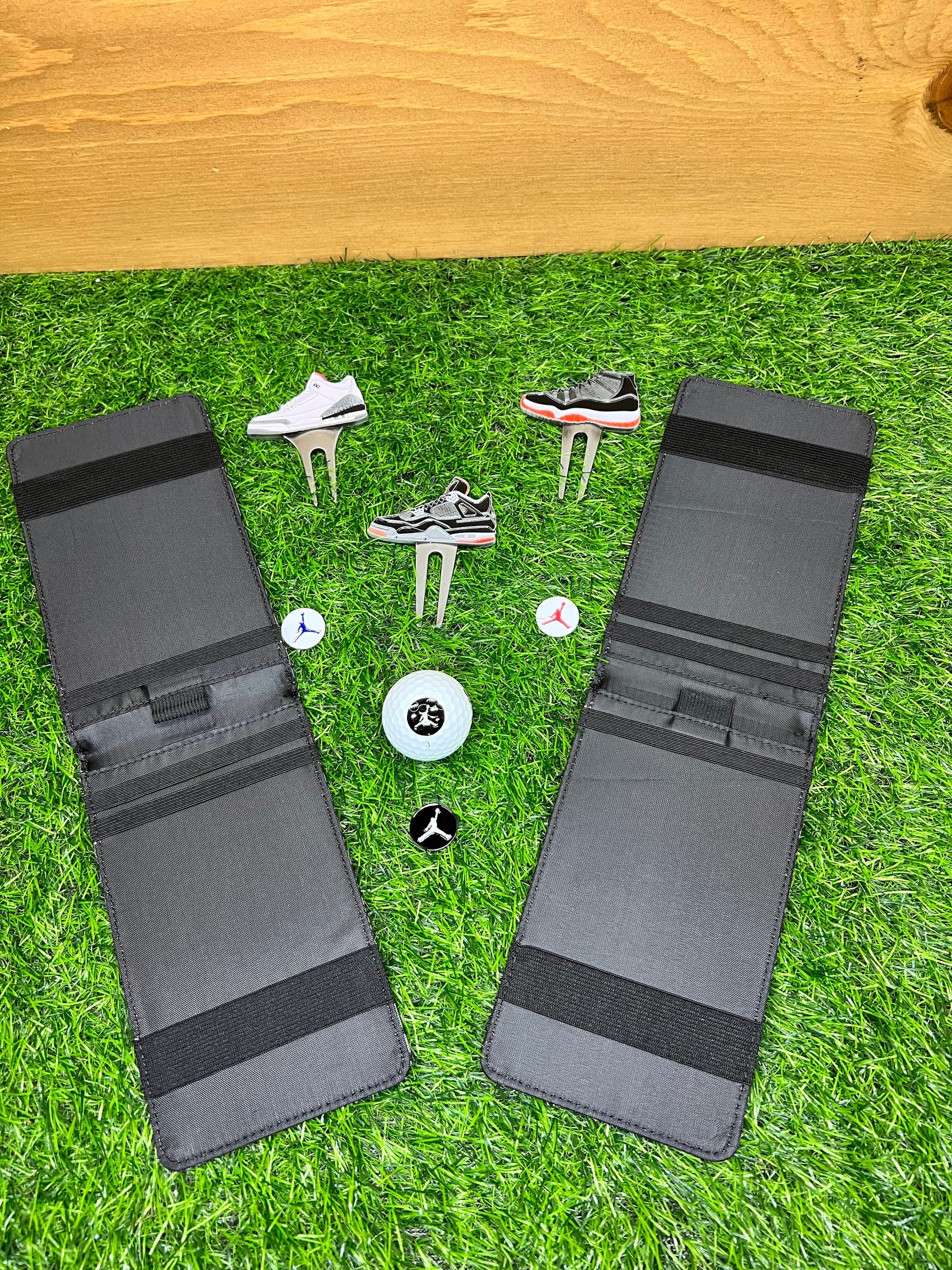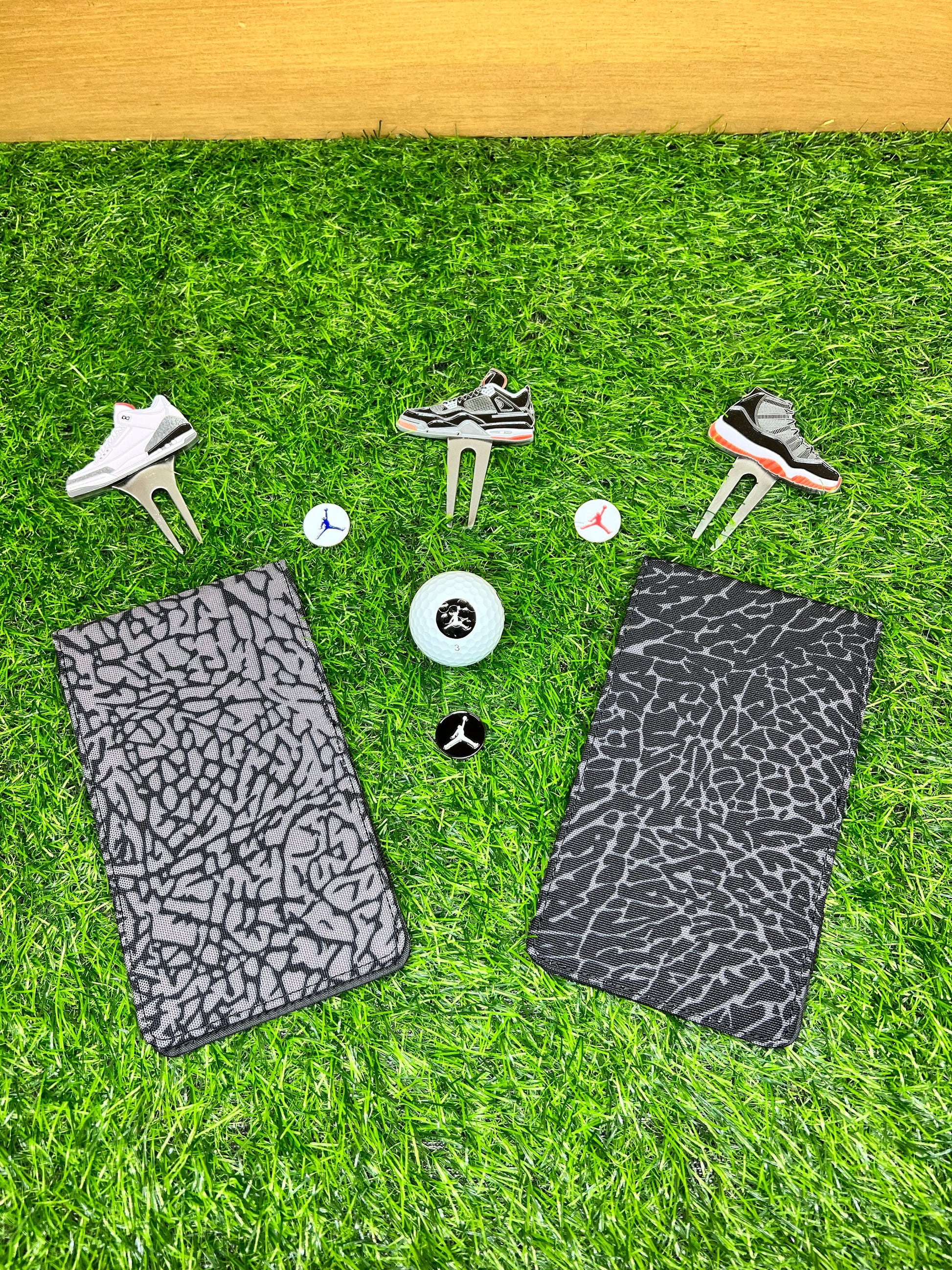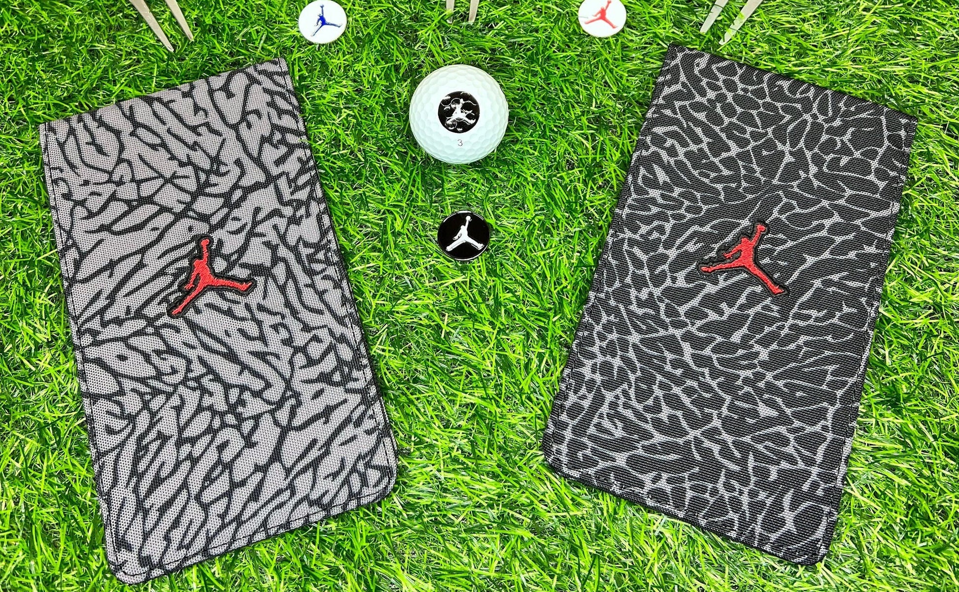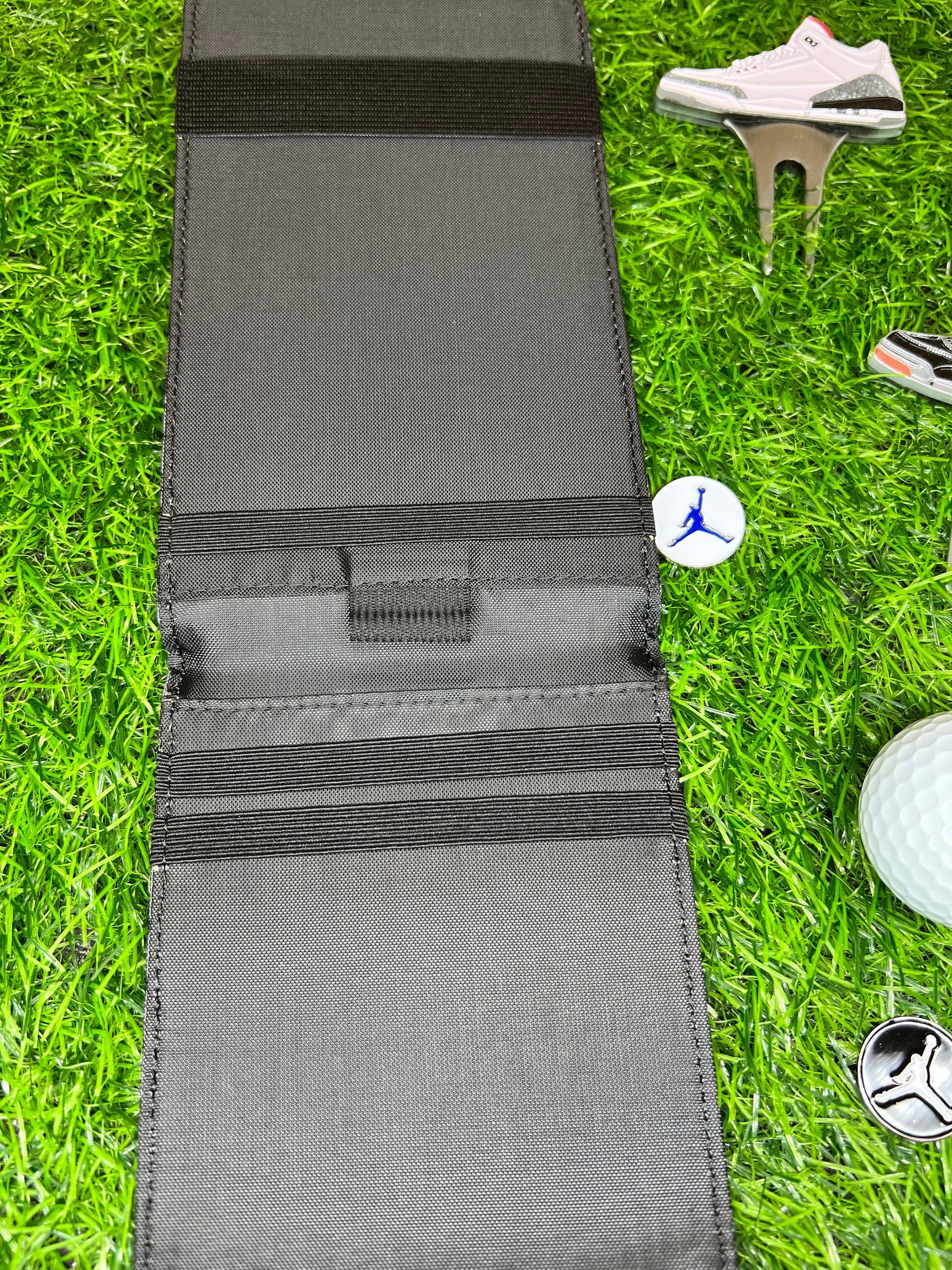 These are Air Jordan Yardage book holders made from waterproof canvas that came from a recycled Air Jordan backpack. They are black or grey colors with Jordan classic elephant print. Holder comes with a place to also hold your pencil to keep score and make notes.